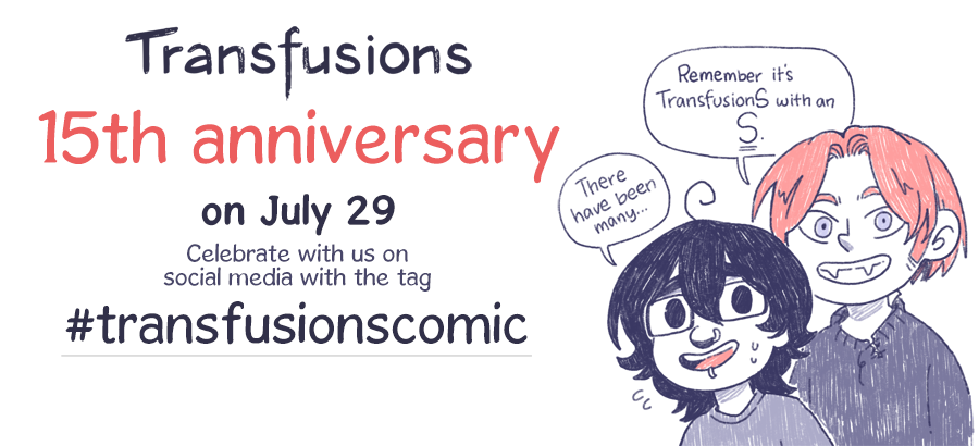 As Transfusions' ending and the 15th anniversary is drawing closer I want to give you guys a head start. The Transfusions anniversary is on July 29th, and I would love for you readers to share your memories and fan creations of Transfusions around that time on social media, and here in the comments of course! Use #transfusionscomic and share your love for Transfusions with other readers during the anniversary. Let's celebrate together!